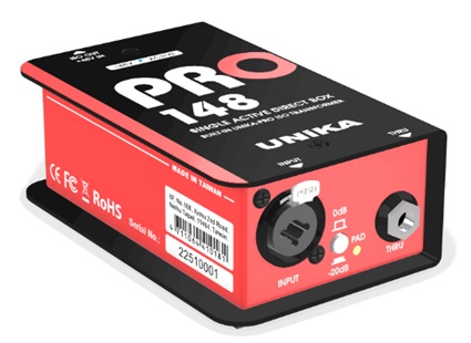 PRO 148是一款主动式单通道DI盒,不同于传统DI,PRO 148使用的电源是+48V幻象电源,而不是传统的9V干电池,因此使用者可以在混音机上或外接幻象电源供应器供电给PRO 148,供电回路和输出信号线共享,无需额外电源导线,上盖预置+48V显示灯;+48V电路特别选用英国OEP PT-4脉冲变压器。