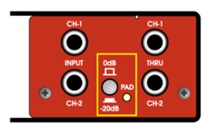 最理想的状态是将衰减器设置在 0dB 位置(按钮弹起)。对于部分高电平输出的信号,可以按下按钮使其信号衰减 20dB,避免信号过载产生削波。当按下按钮时,右侧的 PAD 显示灯会亮起。